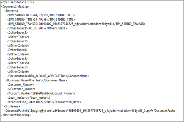 - OtherIndex2 to OtherIndex6 in XML are mapped to Index 2, Index 3, Index4, Index5 and Index 6 values in eSign imaging settings screens. These fields can be left blank, as this Imaging System does not use this.