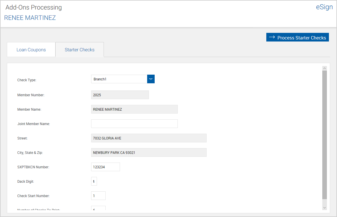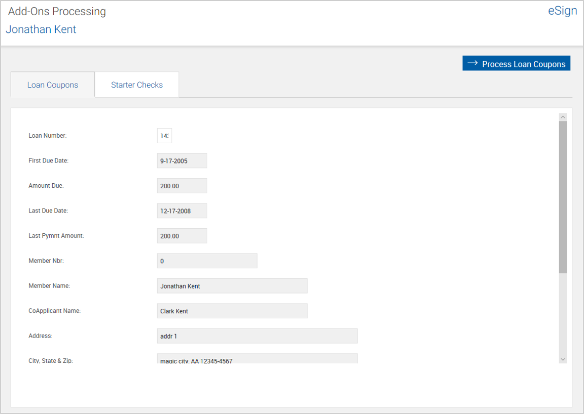 Generate loan payment coupon books and/or starter checks directly in eSign. If the Loan Coupons and/or Starter Checks add-ons have been activated, you will see the Processing > Create Loan Coupons and/or Processing > Create Starter Checks menu options. When one of these options is clicked, the Add-Ons Processing page is displayed. To view a list of Loan Coupons created in the current reporting period, refer to Loan Coupons Report. To view a list of Starter Checks created in the current reporting period, refer to Starter Checks Report. These pages may not be applicable to your installation.