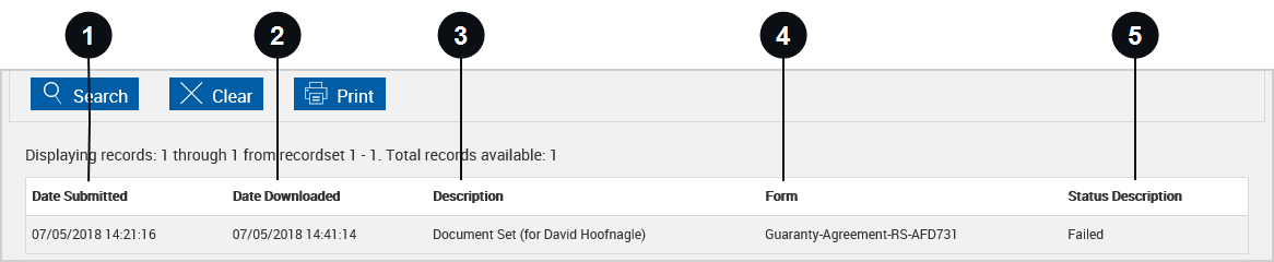 Description | Document set name listed with primary applicant name showing. (Secondary and Co-Applicant names will not display.) |